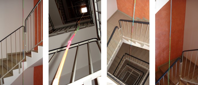 ... entstand nicht als gewolltes "kunst" - projekt, es wäre noch länger geworden. doch es wurde einfach so lang, wie ein 11-geschossiges haus hoch ist. nun verbindet der strohhalm-faden die menschen manchmal reißt er ... mal sehen, wie es die kommunikation im haus beeinflusst.