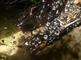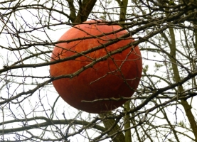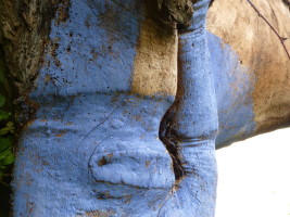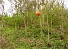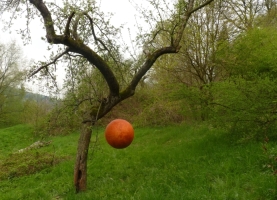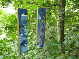 Kleine Bilder hängen in den Bäumen, die den „Tanz des Lebens“ darstellen. Sie malte ich noch mit Acryl. Das Spiel mit den Räumen ging weiter und die zwingende Frage: „Welche natürlichen Farben sind wetterfest?“ So kam ich auf Eitempera und Kaseinbinder, hingen große und kleine hohle Papierkugeln in den Bäumen. Der Prototyp hat die ersten Regen überstanden, doch die Regenfluten 2013 leider nicht. Die Nächsten sind stabiler, in einer kleinen Höhle überwinterte die „Blume des Lebens“, nur auf Papier gemalt. |