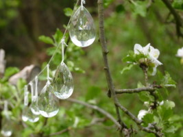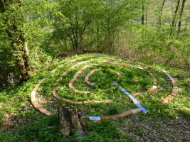 Mein Wunsch entstand, in einen leisen Dialog zu treten, in einen assoziativen Prozess der Gestaltung einzusteigen. „Der Himmelsbaum“ war das erste, was mir gefiel. Ein toter Baum voller Leben war ein Symbol für den steten Wechsel zwischen Leben und Tod und stellte gleichzeitig die Frage: Wann ist Leben und wann ist Tod? Ein alter Apfelbaum mit einem wundervollen Schwung in seinen Ästen bot sich an, Kristalle aufzunehmen und ein Holzbild „Die Liebenden“ . So entstand der „Baum der Tränen“, Tränen der Trauer und Freude. Weiter oben war im Laufe der Zeit ein kleines Plateau entstanden. Ein idealer Platz für ein kleines und doch feines Labyrinth.