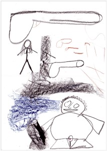 die jungen malten den penis auch als waffe. macht das penis-mg angst? wird hier wieder die aggressive männliche sexualität sichtbar? aggression als zerstörende kraft? diese schlussfolgerung wäre sehr vorschnell und verletzend für die jungen. sie sind auf einer eigenen entdeckungsreise und spiegeln vor allem die welt der erwachsenen wieder. sie entdecken etwas natürlich vorhandenes, falls in der zivilisierten westlichen welt überhaupt von einer natürlichen haltung zu sexualität gesprochen werden kann. die darstellung der penis–waffen lässt verschiedene schlussfolgerungen zu. mit dem blick auf die innere überforderung der jungen ist das MG ein hinweis auf überspielte unsicherheit und einem dahinter liegenden nicht zu erfüllenden leistungsanspruch. auch die möglichkeit, mit dem penis angst zu erzeugen, sollte betrachtet werden. allerdings nicht unter dem aspekt des machtanspruchs über frauen, sondern eher zur abwehr der frau, die den jungen durchaus auch als bedrohung erscheinen kann. (s. vorbereitete fragen) drittens: den jungen sind waffen noch vertrauter als ihre penisse und sie entschärfen ihre erektionen durch abzugvorrichtungen, sie spielen noch.
